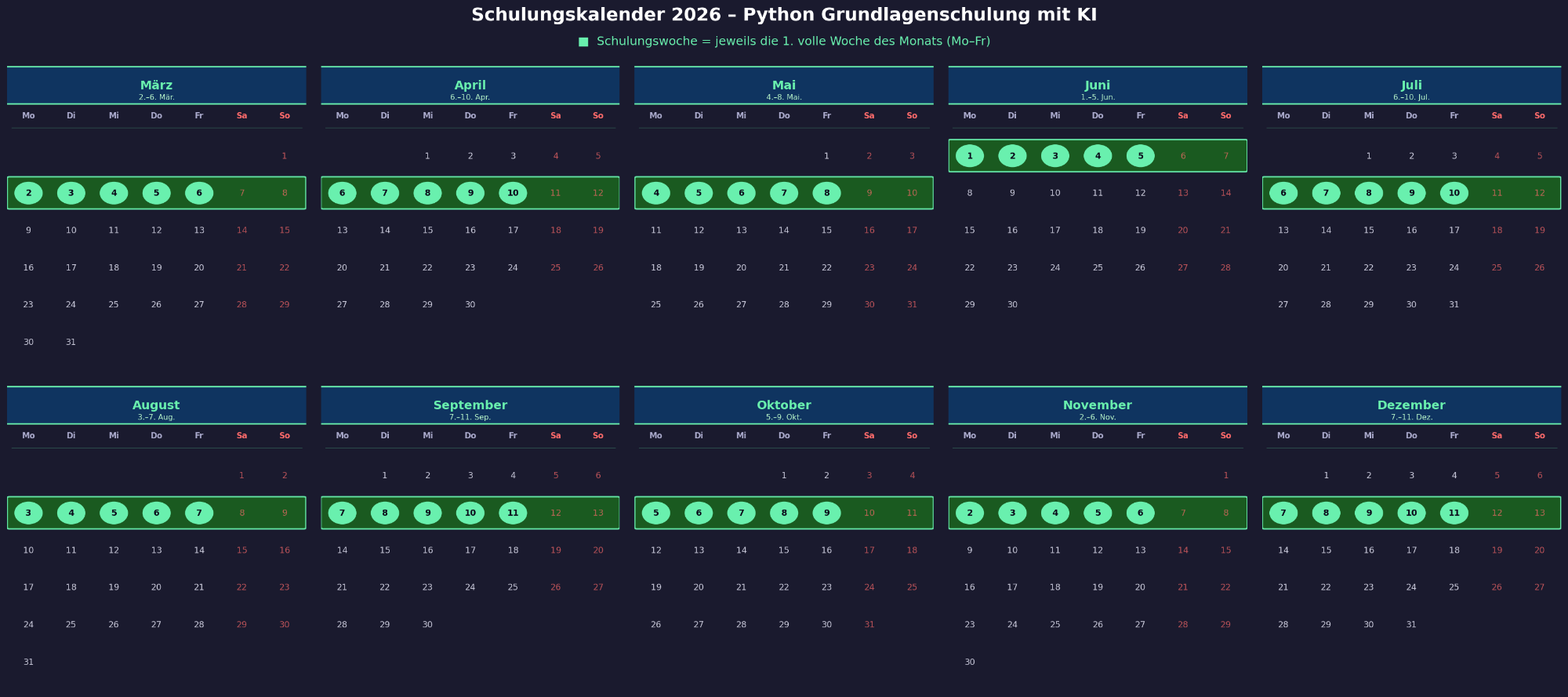 Erste volle Woche jeden Monats Mo.-Fr.